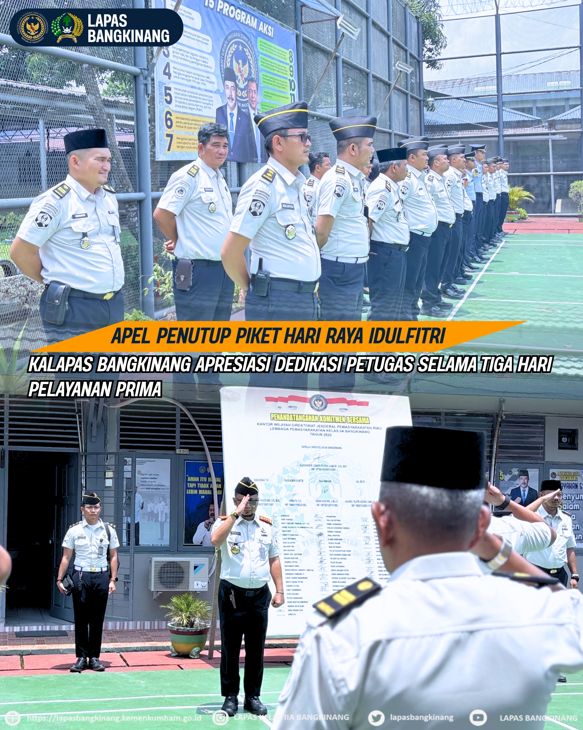 Bangkinang ( otdariau) Lembaga Pemasyarakatan (Lapas) Kelas IIA Bangkinang melaksanakan apel penutup piket Hari Raya Idulfitri setelah rangkaian pelayanan kunjungan yang berlangsung selama tiga hari berjalan dengan aman, tertib, dan lancar. Kegiatan apel ini menjadi momentum evaluasi sekaligus bentuk apresiasi atas dedikasi seluruh jajaran petugas dalam memberikan pelayanan terbaik kepada masyarakat, Senin (23/03/2026).