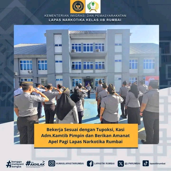 Pekanbaru ( otdariau) Lembaga Pemasyarakatan (Lapas) Narkotika Kelas IIB Rumbai awali hari pertama tugas dalam minggu ini dengan melaksanakan apel pagi dengan penuh khidmat. Apel pagi rutin merupakan media bagi pimpinan untuk memberikan instruksi, apresiasi hingga evaluasi tugas dan fungsi sebagai Petugas Pemasyarakatan dan wejangan diluar tugas dan fungsi sebagai Aparatur Sipil Negara (ASN).