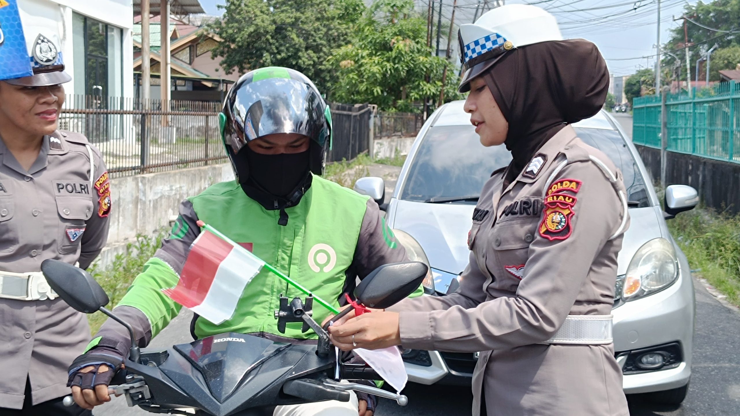 Pekanbaru ( otdariau) Dalam rangka menyambut Hari Ulang Tahun Republik Indonesia ke-80 tahun 2025, Ditlantas Polda Riau bersama Satlantas jajaran melaksanakan kegiatan pembagian Bendera Merah Putih kepada pengemudi kendaraan bermotor di Jalan Kemuning, Kota Pekanbaru, Jumat (8/8/2025).