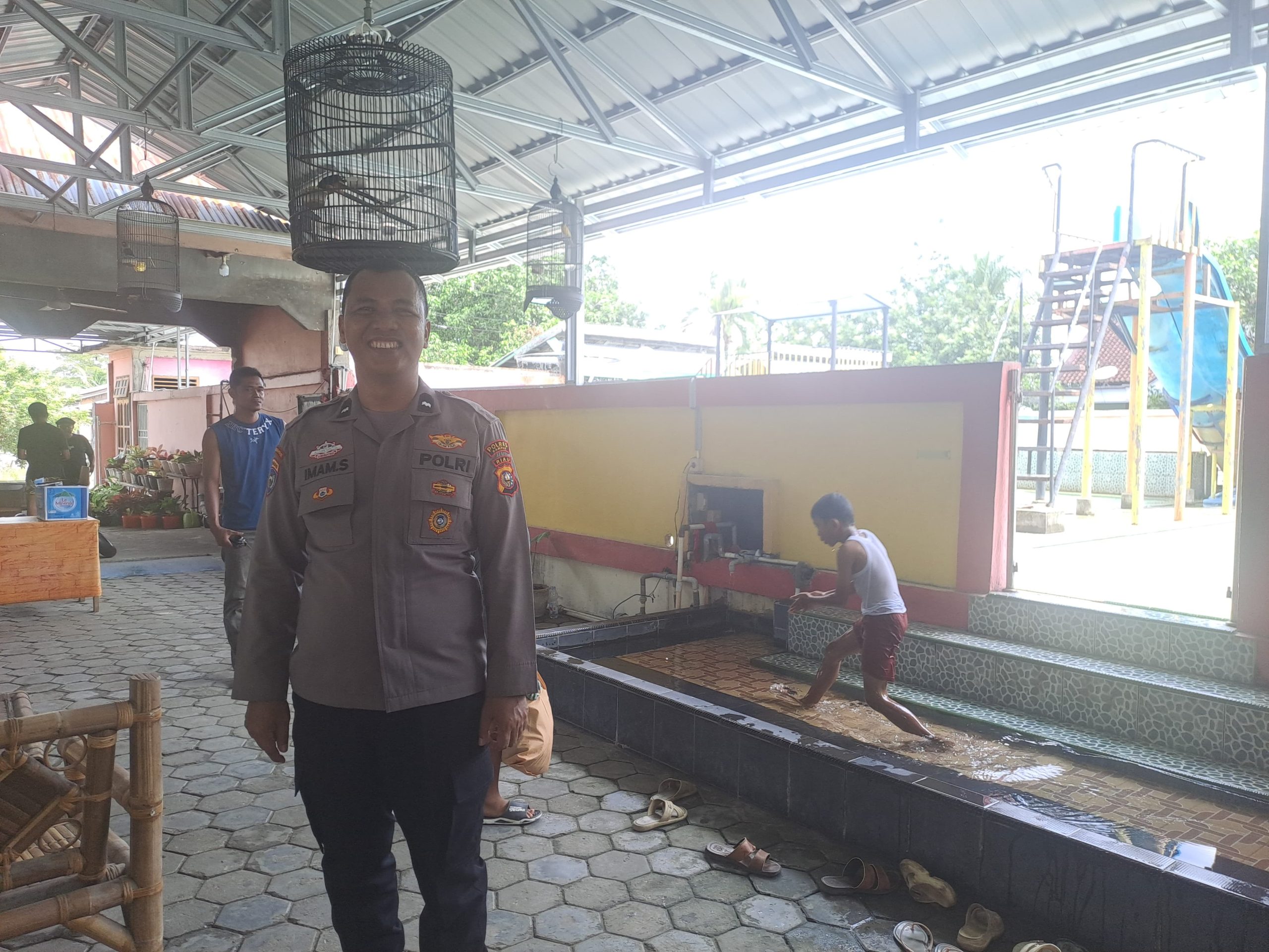 Aipda Imam Suprapto, S.H., Bhabinkamtibmas Desa Tapung Makmur dan Tanah Tinggi, secara langsung berinteraksi dengan para pengunjung, khususnya para orang tua yang tengah menemani putra-putri mereka bermain di sekitar kolam renang.