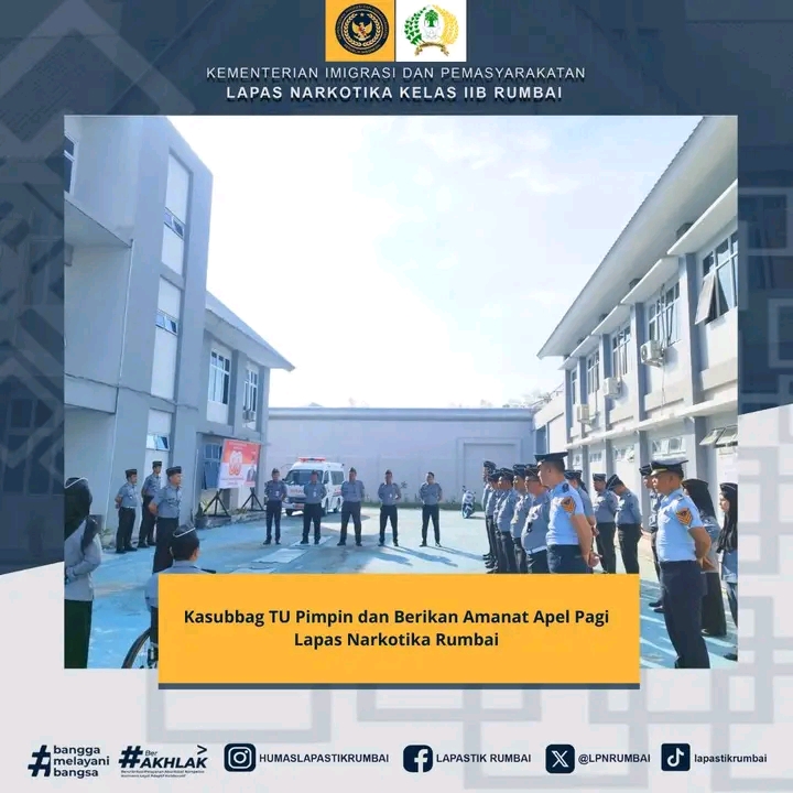 Pekanbaru ( otdariau) Lembaga Pemasyarakatan (Lapas) Narkotika Kelas IIB Rumbai awali hari pertama tugas dalam minggu ini dengan melaksanakan apel pagi dengan penuh khidmat. Apel pagi rutin merupakan media bagi pimpinan untuk memberikan instruksi, apresiasi hingga evaluasi tugas dan fungsi sebagai Petugas Pemasyarakatan dan wejangan diluar tugas dan fungsi sebagai Aparatur Sipil Negara (ASN).