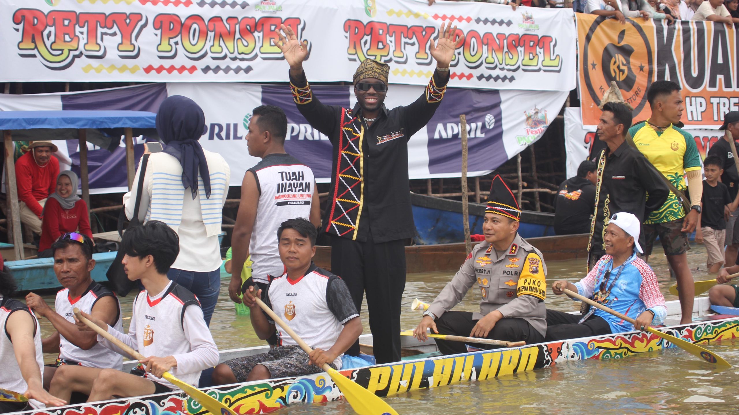 Melly Mike berada di atas perahu bersama Kapolda Riau Irjen Herry Heryawan. Dikha bocah Pacu Jalur juga ikut dalam jalur yang sama.