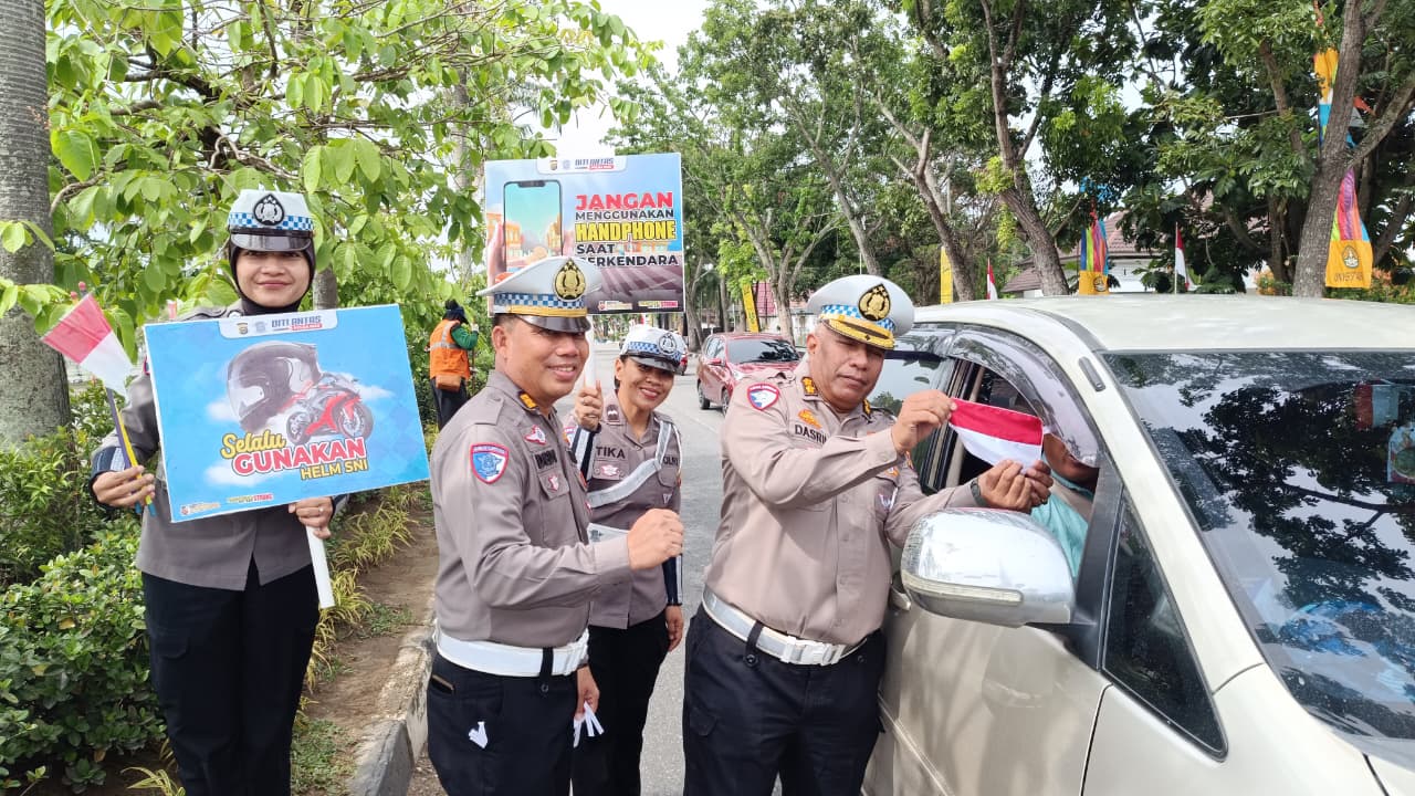 Pekanbaru ( otdariau) Suasana pagi di Jalan Diponegoro, Pekanbaru, terasa berbeda pada Kamis (14/8/2025). Di simpang lampu merah depan kediaman Kapolda Riau, para pengendara roda dua dan roda empat tersenyum ketika disapa oleh personel Subdit Kamsel Ditlantas Polda Riau. Tidak hanya sapaan ramah, mereka juga menerima bunga, bendera Merah Putih, serta brosur himbauan keselamatan berkendara.
