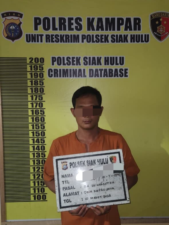 SIAKHULU,( otdariau ) AM (32) tidak hanya bisa pasrah saat ditangkap Polsek Siak Hulu, pasalnya ia ditangkap karena peredaran Narkoba jenis sabu-sabu di Kampung Baru Desa Kepau Jaya Kecamatan Siak Hulu Kabupaten Kampar, Senin (9/3/2026) sekira pukul 22.00 Wib.