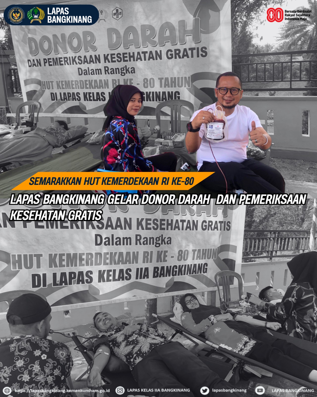 Bangkinang ( otdariau) Dalam rangka memperingati Hari Ulang Tahun (HUT) Kemerdekaan Republik Indonesia ke-80, Lembaga Pemasyarakatan (Lapas) Kelas IIA Bangkinang menyelenggarakan kegiatan donor darah dan pemeriksaan kesehatan gratis bagi masyarakat, Jumat (22/8). Acara ini terbuka untuk umum, termasuk bagi pengunjung serta keluarga warga binaan pemasyarakatan (WBP) yang datang ke Lapas.
