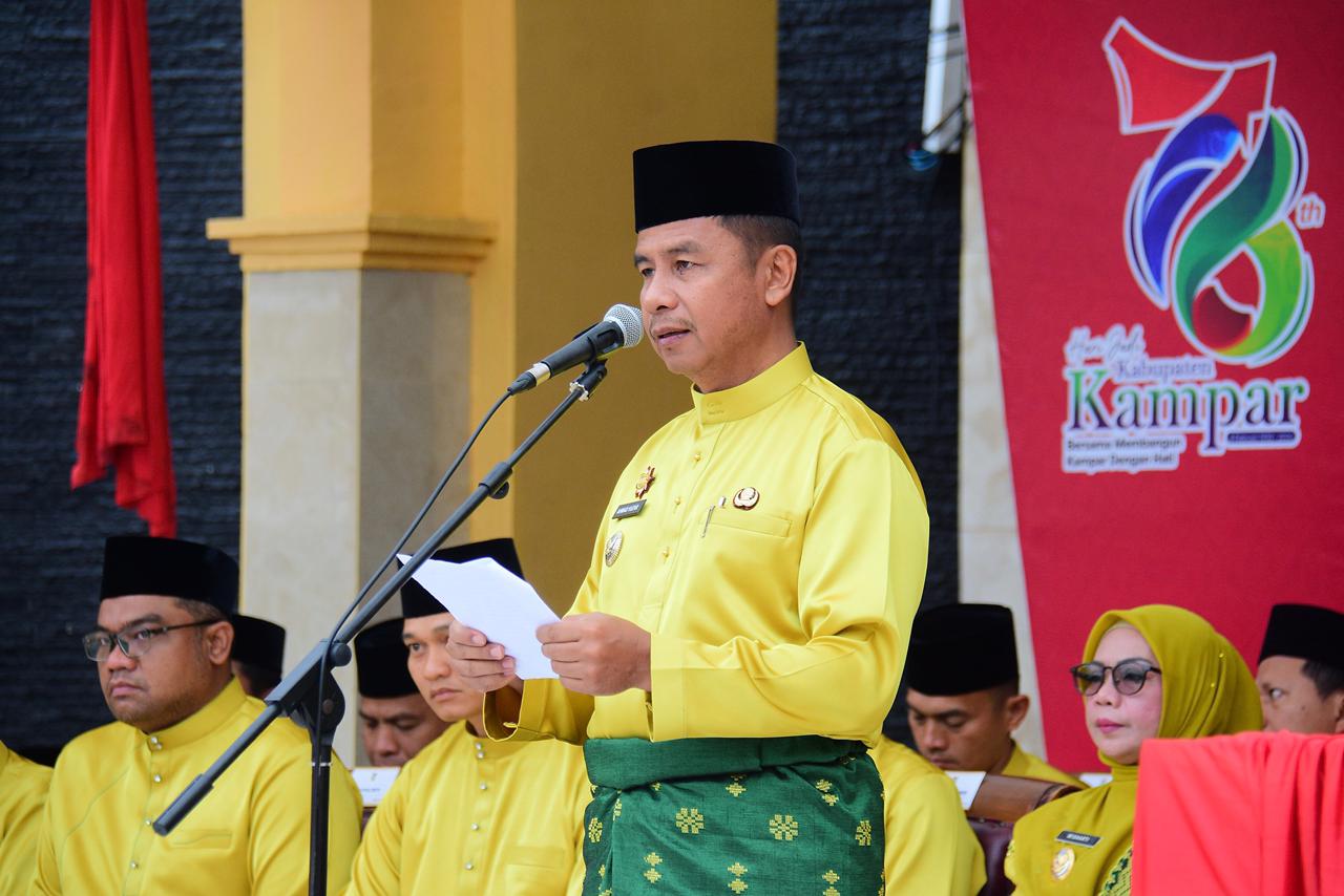KAMPAR ( otdariau ) Bupati Kampar H. Ahmad Yuzar S.Sos, MT memaparkan sejumlah program prioritas yang telah ditelurkan dalam 1 tahun pemerintahnya bersama Wakil Bupati Dr. Hj. Misharti, S.Ag, MSi saat menyampaikan arahan dalam Upacara Peringatan Hari Jadi Kampar ke-76 yang berlangsung di Lapangan Upacara Kantor Bupati Kampar, Jumat (6/2/2026) pagi.